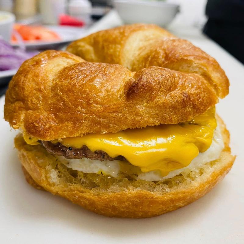 Croissant, fried egg patty, American cheese with your choice of sausage, ham, or bacon